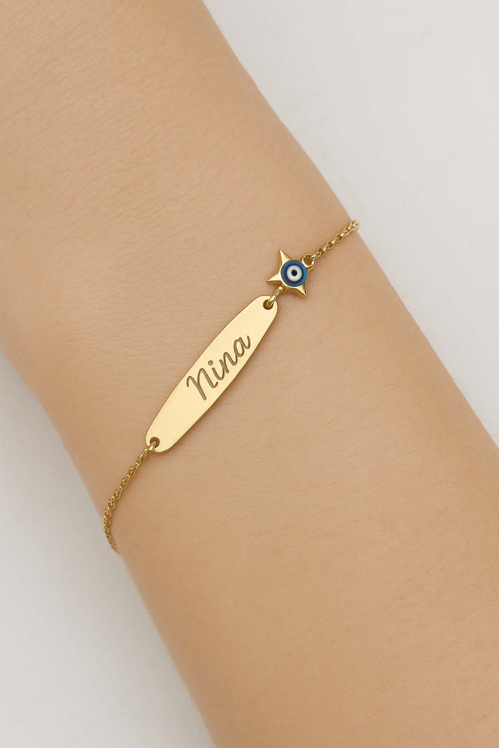 Ein filigranes Armband, das sowohl stilvoll als auch bedeutungsvoll ist. Die Kombination aus dem goldenen Stern mit Nazar-Amulett und der personalisierbaren Gravurplatte macht dieses Schmuckstück zu einem ganz besonderen Begleiter – ob als Geschenk oder für dich selbst.