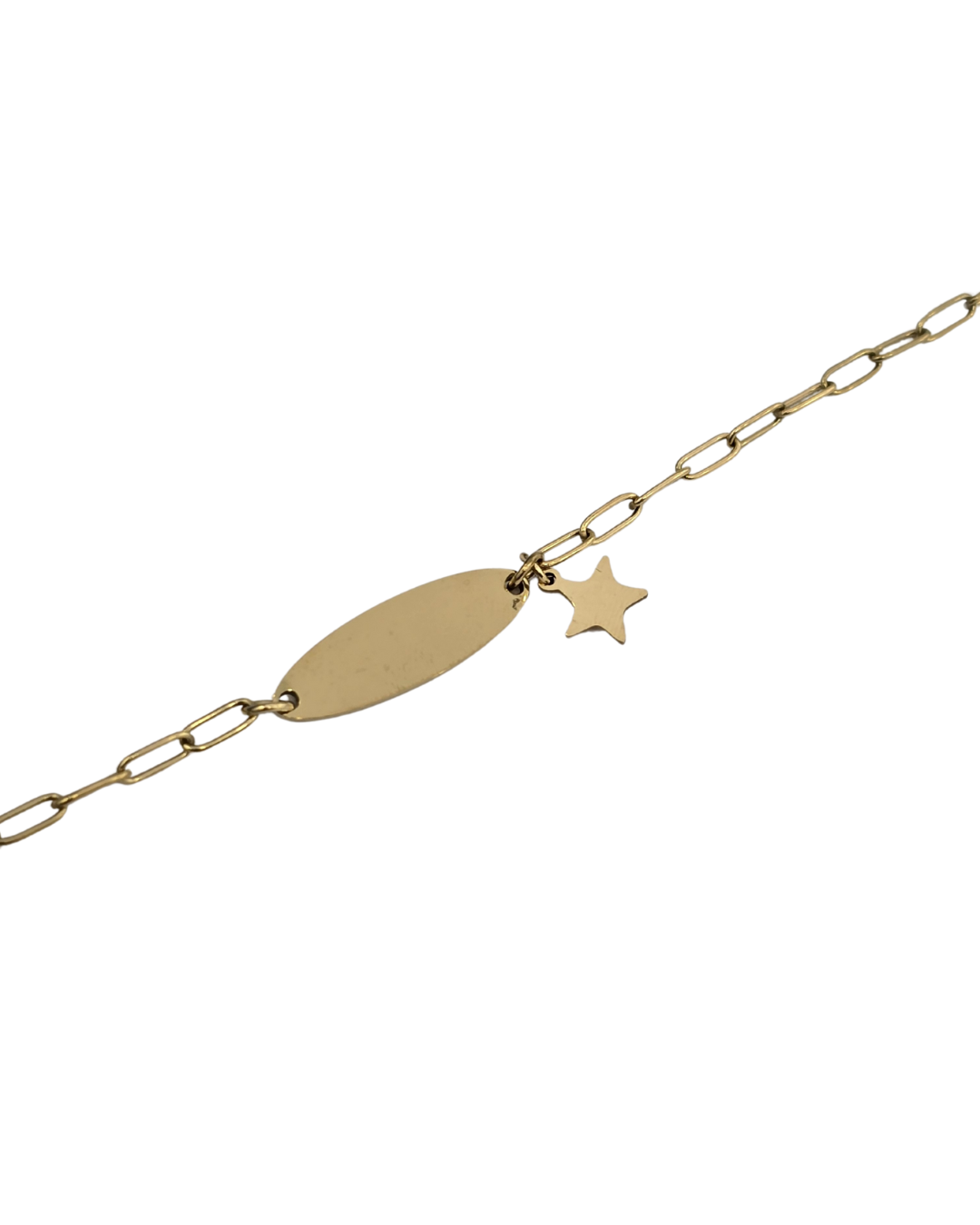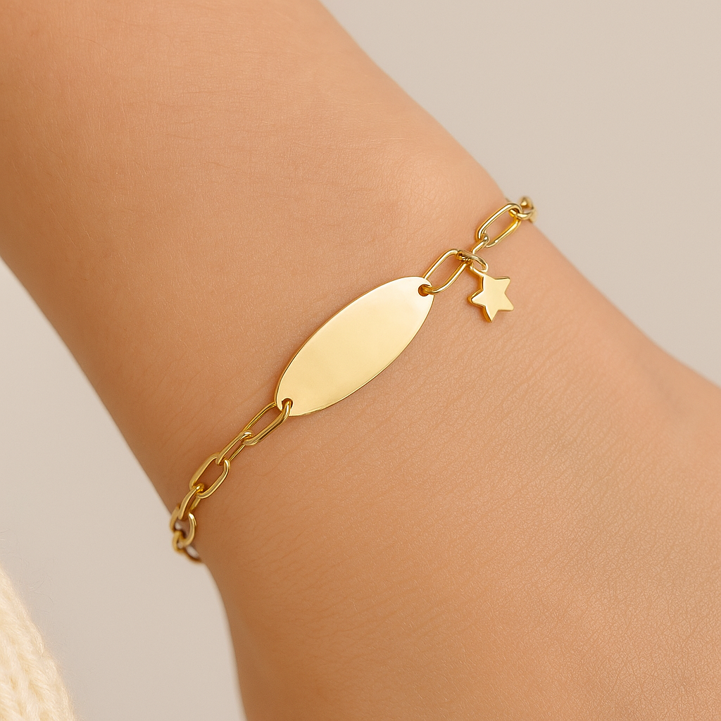 Die schlichte, ovale Gravurplatte wird durch einen funkelnden Stern-Anhänger ergänzt – perfekt, um deinen Namen, ein wichtiges Datum oder ein bedeutungsvolles Wort stilvoll zu präsentieren.
