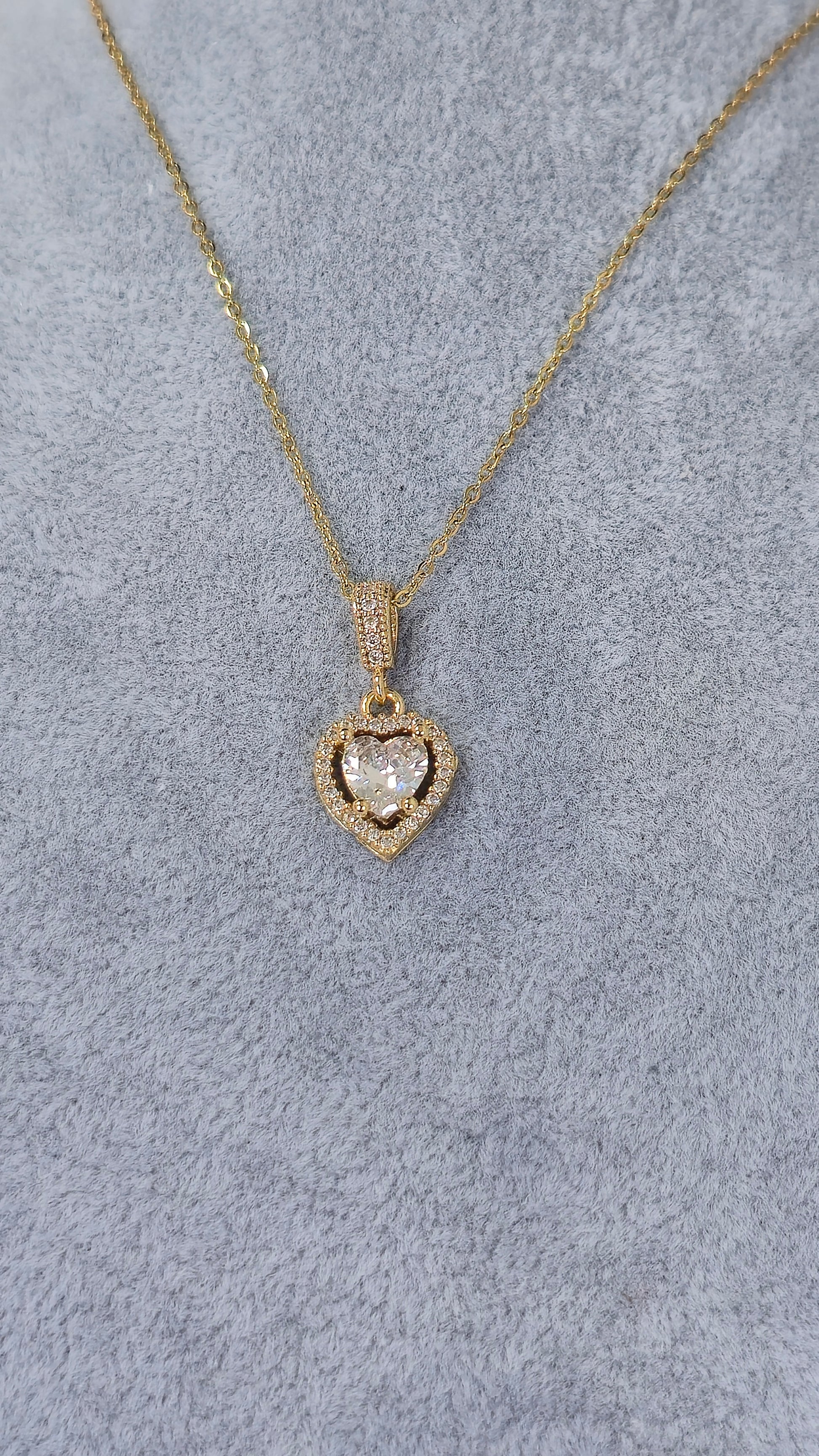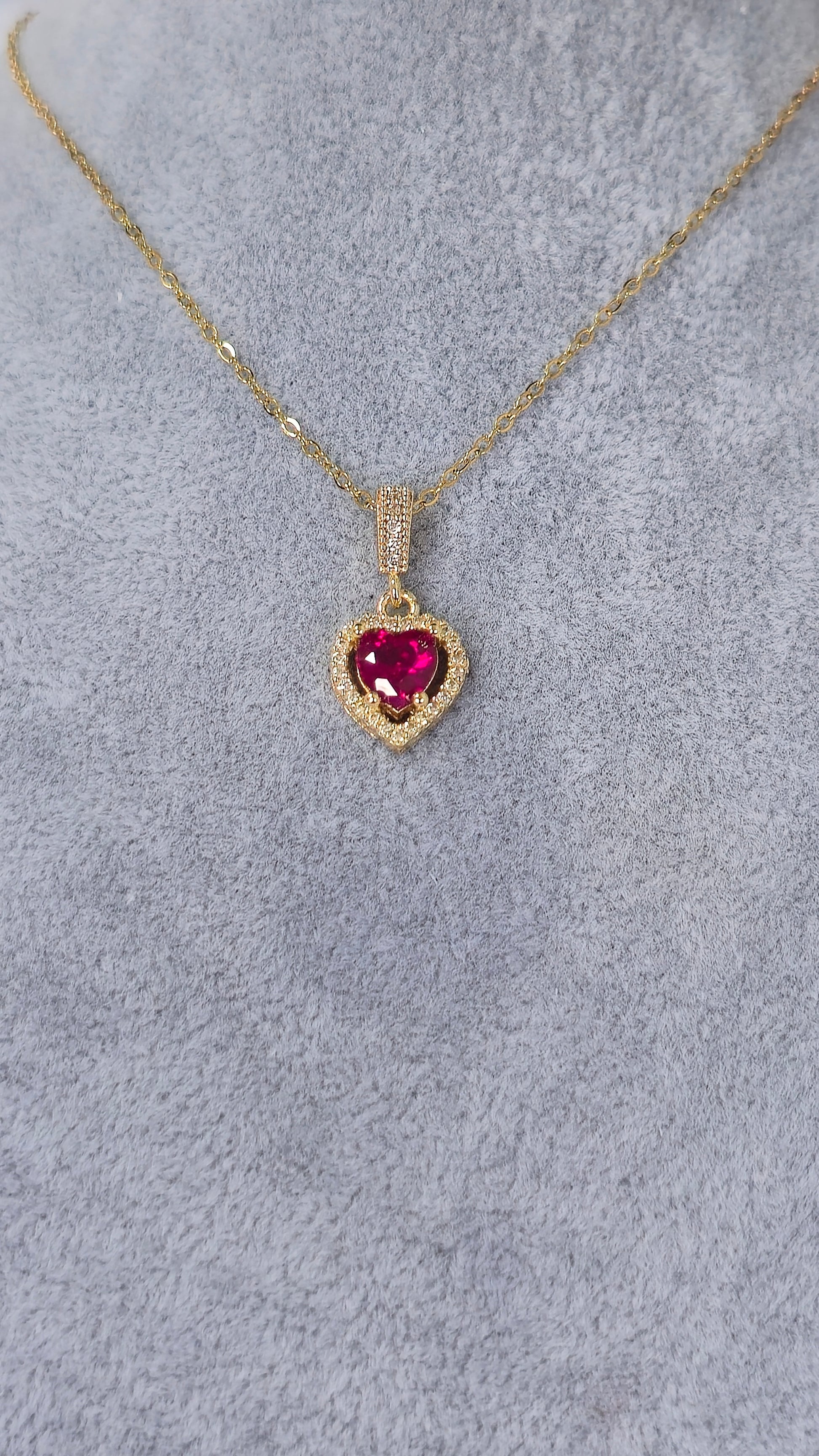 Elegante Vergoldete kette mit einem herzförmigen Anhänger, besetzt mit einem violetten Stein. Umrahmt von funkelnden kleinen Steinen, vereint sie Glanz und Eleganz.
