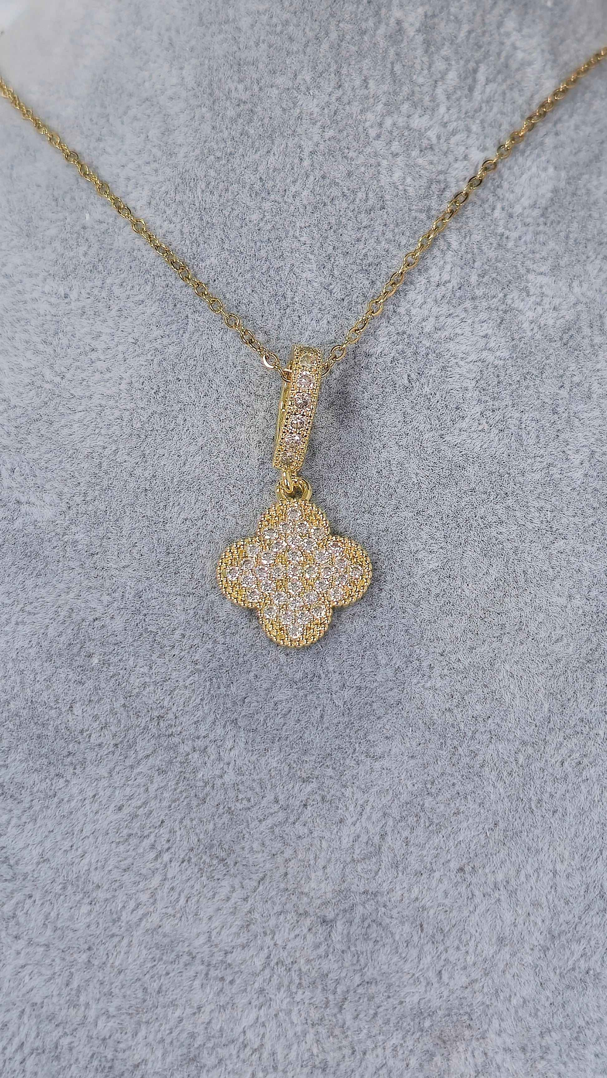 Elegante Halskette mit einem kleeblattförmigen Anhänger aus goldfarbenem Metall. Verziert mit funkelnden Zirkonsteinen, die Glanz und Eleganz vereinen. Perfekt für den Alltag und besondere Anlässe.